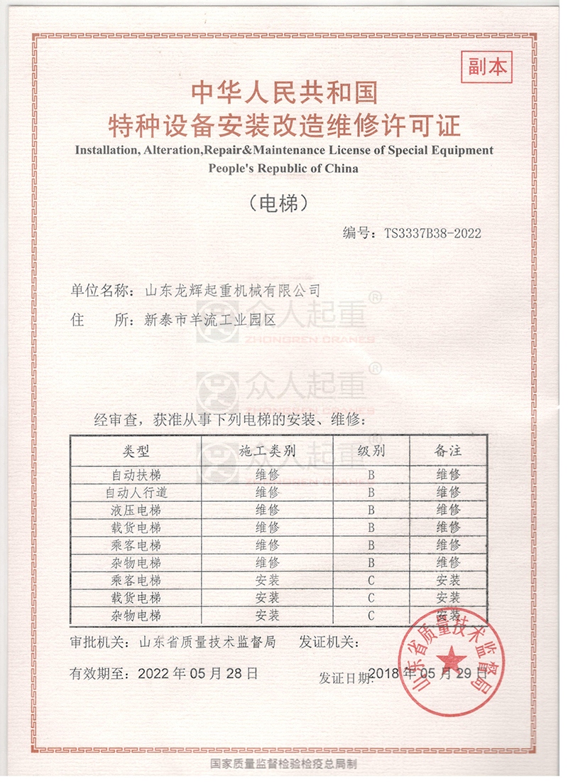 電梯安裝維修資質(zhì) elevator license for installation/ maintenance(original)